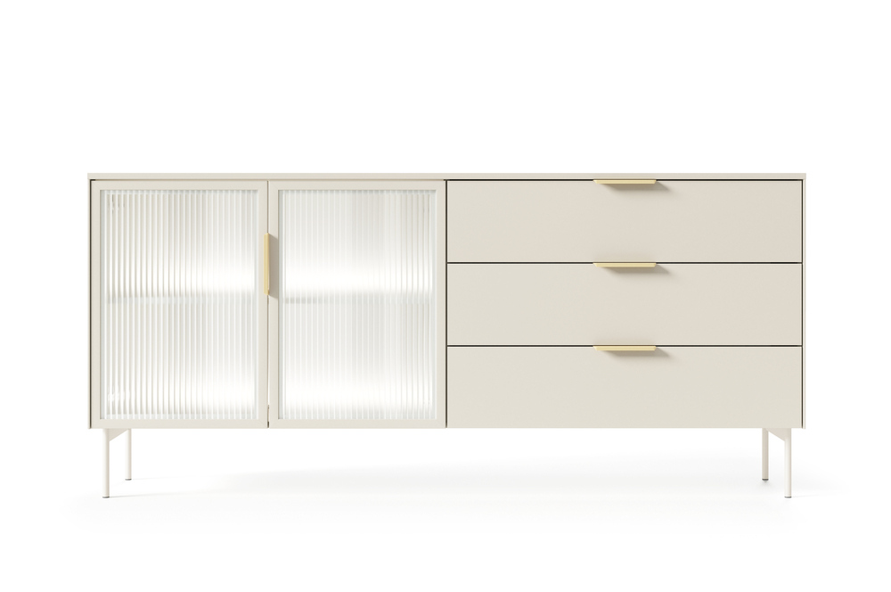 Komoda z kolekcji Lumi to mebel, który wprowadza do Twojego wnętrza elegancję. Materiał który zastosowano w produkcji to płyta laminowana, mdf, szkło ornamentowe-hartowane. Cały urok dodają metalowe nóżki i złoty uchwyt. Kupując meble z tej kolekcji możesz być pewien że masz w swoim domu nowoczesność, luksusową kompozycję.