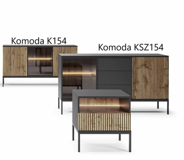 Kolekcja mebli SENTO to premiera tego roku,  wyróżniająca się charakterystycznymi  frontami 3D w kolorze dąb wotan. Witryna wykonana jest z płyty laminowanej, która cechuje się podwyższoną odpornością na zarysowania. Zestaw został postawiony na wysokich, metalowych, czarnych nóżkach podkreślających nowoczesny design zestawu.