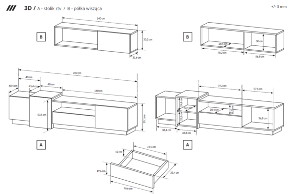 • stolik rtv – szer. 220 cm / wys. 53,5 cm / gł. 45 cm