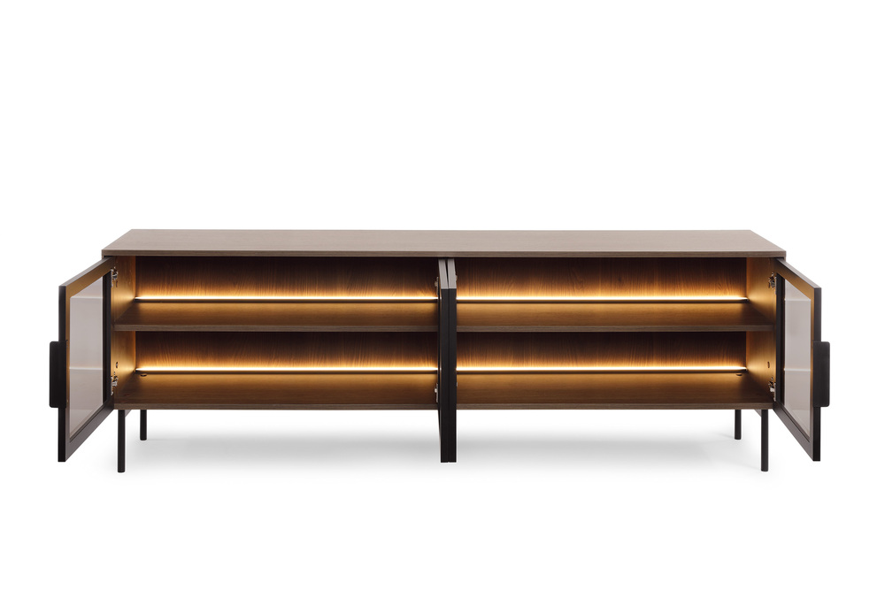 Szafka RTV z kolekcji Lumi to mebel, który wprowadza do Twojego wnętrza elegancję. Materiał który zastosowano w produkcji to płyta laminowana, mdf, szkło w kolorze brązowym. Cały urok dodają metalowe nóżki i czarny uchwyt. Kupując meble z tej kolekcji możesz być pewien że masz w swoim domu nowoczesność, luksusową kompozycję.