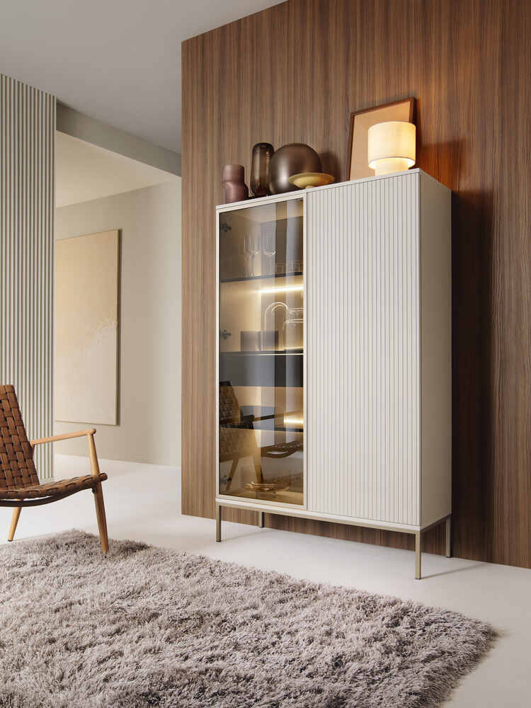 Kolekcja mebli SENTO to premiera tego roku,  wyróżniająca się charakterystycznymi  frontami 3D – ryflowane. Witryna wykonana jest z płyty laminowanej, która cechuje się podwyższoną odpornością na zarysowania. Zestaw został postawiony na wysokich, metalowych, złotych nóżkach podkreślających nowoczesny design zestawu.